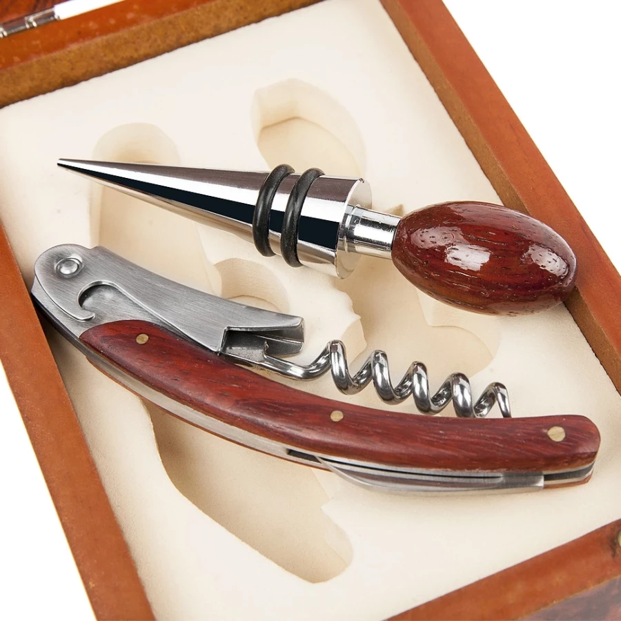 Lasergraveeringuga veinikomplekt on elegantne kingitus, mis meeldib kõigile. See on valmistatud puidust ja metallist, mis muudab selle välimuse väga stiilseks. Komplekti kuuluvad avamismehhanism ja kork maitsekas puidust karbis, millele saab graveerida teie ettevõtte logo või isikliku pühenduse. See on ideaalne kingiidee pikaajalise kliendi või töötaja või partneri tunnustamiseks. Kaheosaline veinikomplekt on originaalne ja ebatavaline reklaamkingitus, mis rõõmustab saajat oma esteetilise disainiga ja mida kindlasti hinnatakse.
